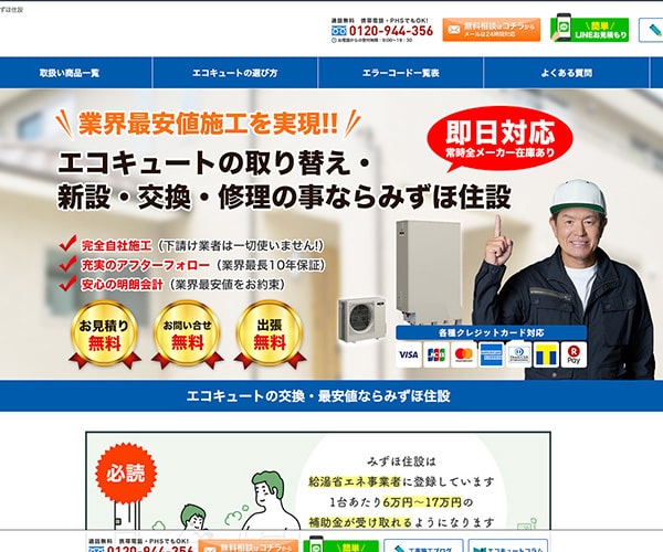 さらに、「みずほ住設」はメーカーと直接取引を行っているため、高品質なエコキュートをリーズナブルな価格で提供可能。信頼性の高いサービスと充実したアフターサポートが、「みずほ住設」の大きな魅力です。